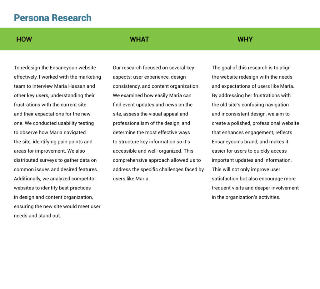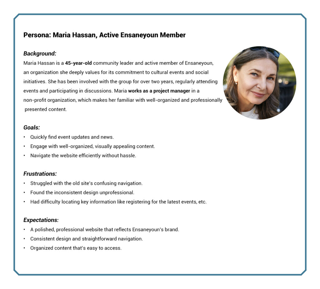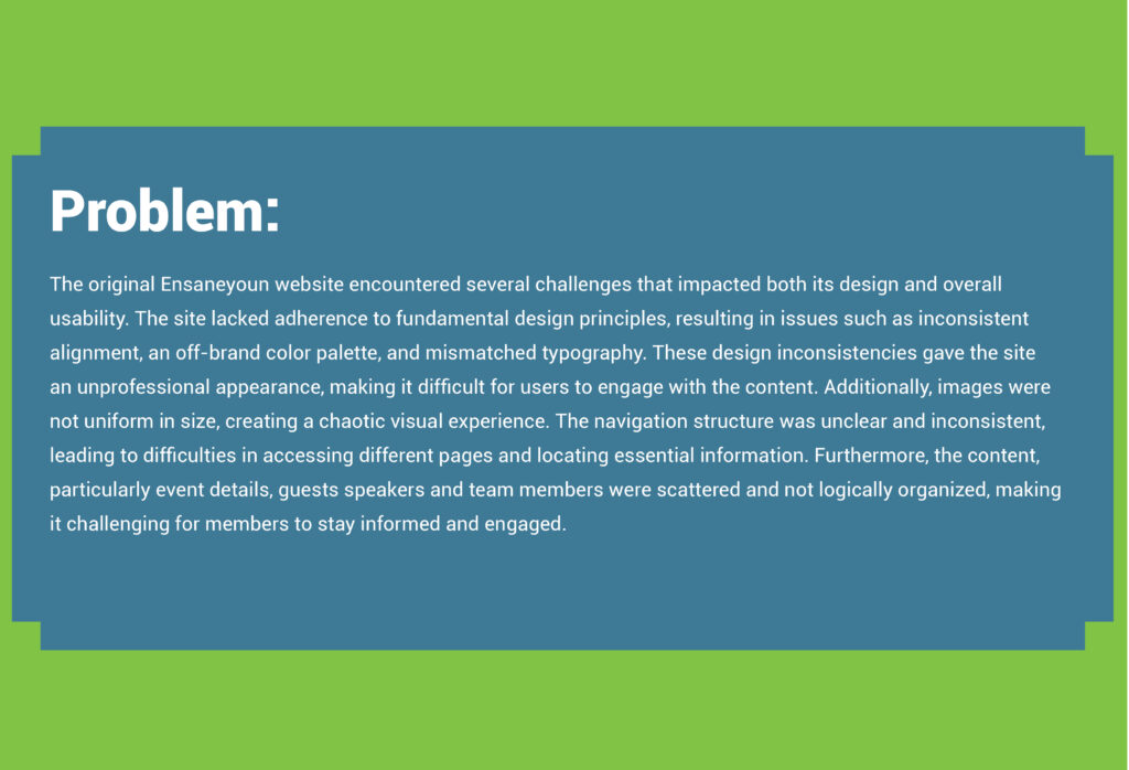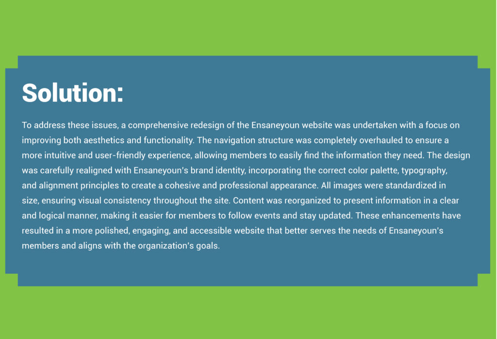 We were hired by Ensaneyoun to redesign their website and address key usability issues, including poor navigation, inconsistent design elements, and disorganized content. Together, we realigned the design with the organization’s brand identity by standardizing colors, typography, and image dimensions. We also restructured the site’s navigation and content layout to make it easier for members to find important information and stay engaged. This project was especially meaningful as it not only improved the user experience but also helped strengthen the community’s connection to Ensaneyoun.